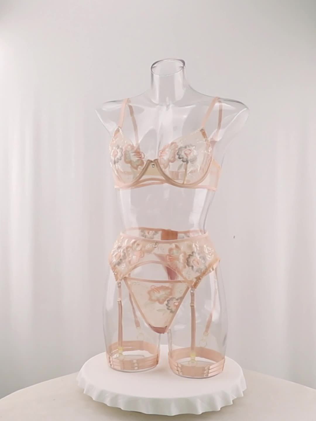 Lingerie Set with Sexy Embroidered Floral Pendant Intricate Handcrafted Four-Piece Collection